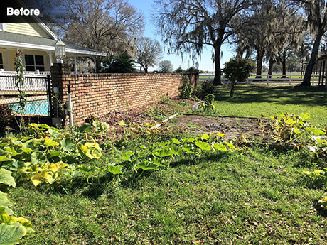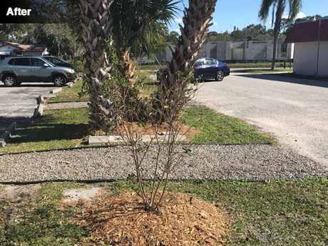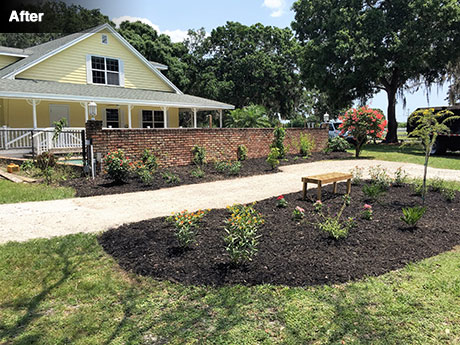 Entrance cleaned up and weeded. Plantings included Variegated Arboricola, Gardenia, Carissa "Emerald Beauty', Croton 'Petra', Pinwheel Jasmine, Dwarf Tibochina, Ti Plant 'Red Sister', Queen Emma Crinum Lily and African Iris. Mulch was laid in the beds and brown river rock was laid around the tree to neaten and help prevent weeds and water loss. The entrance will need two years to grow in and present fully.