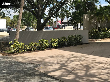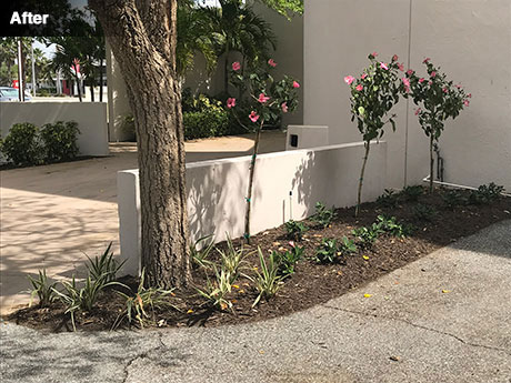 Greenscapes replaced the irrigation controller and repaired the system. We planted Variegated Arboricola on the north side of the building and installed top soil, Hibiscus, Green Island Ficus, Blue Flax Lily and a Gold Tree on the south side. We re-potted two pots on the walkway to the front door with potting soil and Ti Plant "Auntie Lou". Finally, we neatened all the beds with Cocoa Brown Mulch. The new plantings will need about 2 years to grow in fully.